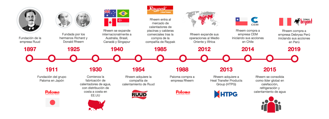Los hermanos Richard y Donald Rheem fundaron Rheem Manufacturing Company en Emeryville, California, en 1925. Si bien la compañía ha producido varios productos en sus casi 100 años de funcionamiento, Rheem es actualmente el único fabricante en el mundo que produce calefacción, refrigeración y agua. Productos de calefacción, de piscina y spa y de refrigeración comercial, y es el mayor fabricante de productos de calentamiento de agua en América del Norte.